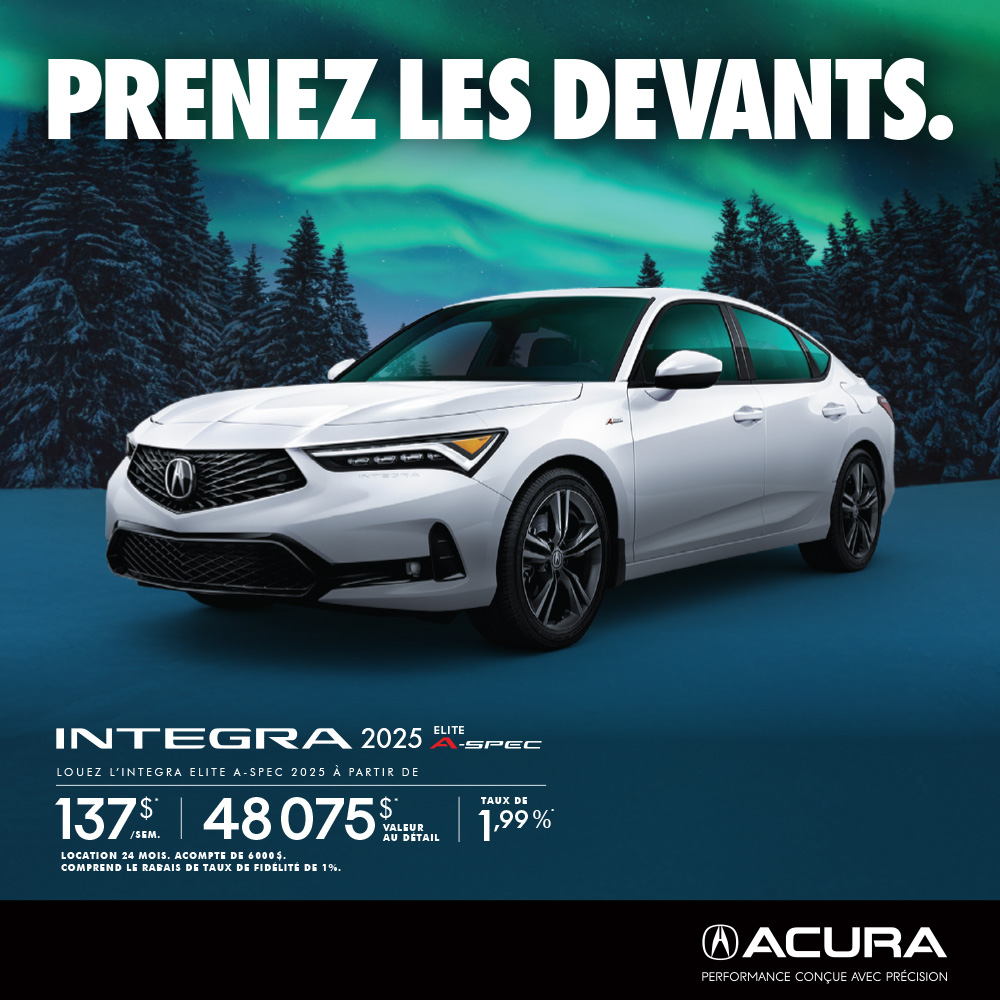†Offre de location à durée limitée offerte par l'entremise des Services Financiers Acura, sous réserve d’approbation du crédit. Exemple représentatif de location basé sur un véhicule neuf et jamais immatriculé INTEGRA ÉLITE A-SPECMC2026 (DE4H6SJ) ou INTEGRA ÉLITE A-SPECMC 2026 (DE4G7SJ). Le prix de location du véhicule est de 46 575 $ à 48 075 $. Offre de location prolongée applicable à tous les clients : Taux de location à partir de 2,99 % jusqu'à 24 mois. Le paiement hebdomadaire est de 145 $ avec un a acompte de 5 000 $ à 6 000 $ ou valeur ou échange équivalent, dépôt de garantie de 0 $ et premier paiement exigé au début du contrat de location. Obligations de location de 20 760 $ à 21 080 $. Offre de location applicable aux clients fidélité admissibles seulement (comprend une réduction de fidélité de 1 % pour les clients admissibles) : Taux de location à partir de 1,99 % jusqu'à 24 mois. Le paiement hebdomadaire est de 137 $ avec un a acompte de 5 500 $ à 6 000 $ ou valeur ou échange équivalent, dépôt de garantie de 0 $ et premier paiement exigé au début du contrat de location. Obligations de location de 19 748 $ à 20 248 $. POUR TOUTES LES OFFRES : les paiements à la location comprennent 2 595 $ en frais de transport et de préparation; la surcharge sur le climatiseur de 100 $; les frais de concessionnaire (jusqu'à 1 500 $); les frais réglementaires (jusqu’à 136 $), les frais d’inscription d’un droit (jusqu’à 128.50 $, y compris les frais de l’agent d’inscription); ainsi que tous les autres frais, droits, et redevances applicables (qui peuvent tous varier selon la région et le concessionnaire). Le permis, l'assurance, l’immatriculation, les options et les taxes sont en sus. Jusqu'à 104 paiements hebdomadaires requis. Allocation de 16 000 km/année; surcharge de 0,15 $/km pour les kilomètres excédentaires. Des conditions s’appliquent. Modèle présenté à des fins d'illustration uniquement. Modèle présenté à des fins d'illustration uniquement. Les offres prennent fin le 31 mars 2026 et peuvent être modifiées ou annulées sans préavis. Le concessionnaire peut vendre ou louer à moindre prix (mais peut ne pas être disponible dans tous les cas). Une commande ou un échange entre concessionnaires peut être nécessaire. Jusqu'à épuisement des stocks. Certaines caractéristiques ne sont disponibles que sur certains modèles. Visitez acura.ca ou votre concessionnaire Acura pour les détails. ©Acura, une division de Honda Canada Inc.